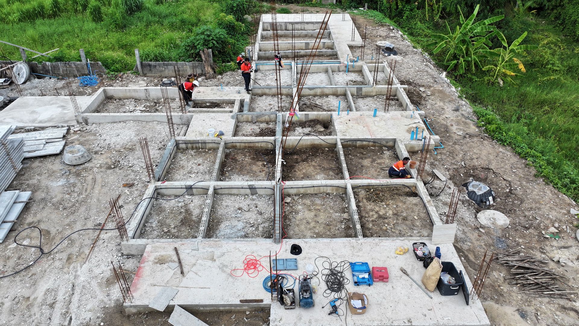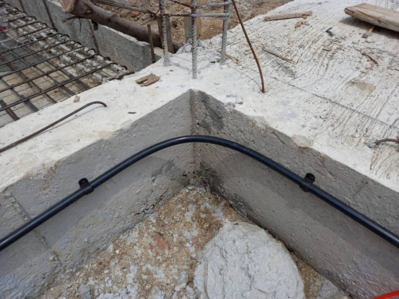 เจ้าหน้าที่จะเริ่มดำเนินการหลังจากทางฝ่ายก่อสร้าง ได้ทำการเทคานคอดินเสร็จเรียบร้อยแล้ว โดยเจ้าหน้าที่จะทำการวางท่อติดกับแนวคานด้านใน รอบตัวอาคาร ท่อน้ำยาเคมีจะมีวาล์วอัดน้ำยาเคมีไว้รอบอาคารเป็นช่วง ๆ สำหรับอัดน้ำยาเคมีเข้าไปใต้พื้นอาคารได้ตลอดอายุบ้าน