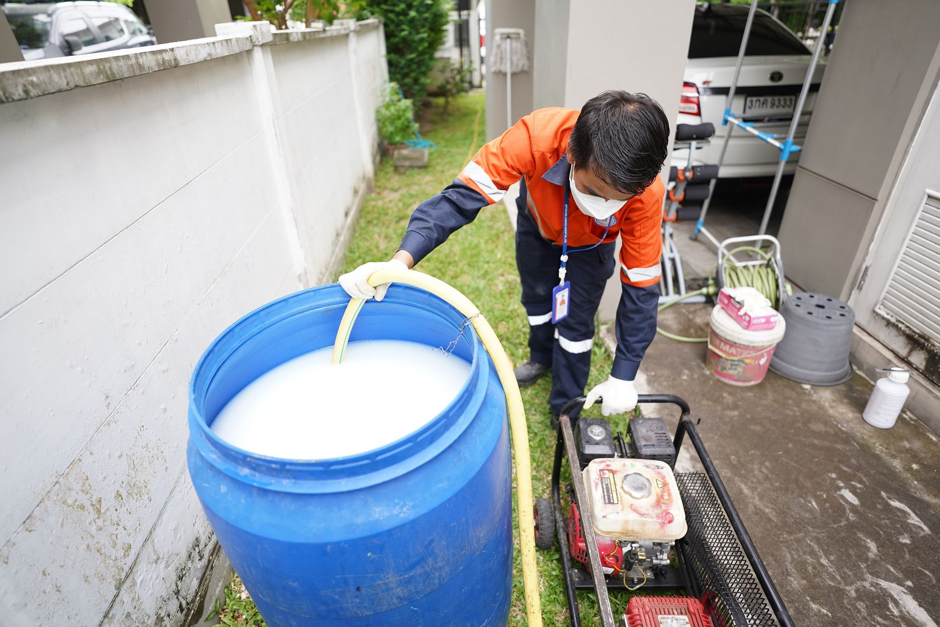 1. หลังจากวางท่อน้ำยาเคมีเรียบร้อยแล้ว ฝ่ายก่อสร้างสามารถปรับพื้นดินก่อนเทคอนกรีต เจ้าหน้าที่จะทำการอัดน้ำยาภายในตัวบ้านทุกตารางเมตร โดยใช้หัวอัดน้ำยา (High Pressure Injector) ปักลงไปในดินประมาณ 50-100 เซนติเมตร และอัดน้ำยาลงดินตารางเมตรละ 5 ลิตร หลังจากอัดน้ำยาลงดินเรียบร้อยแล้ว เจ้าหน้าที่จะฉีดพ่นสารเคมีพรมหน้าดินอีก 2 ลิตร ต่อ 1 ตารางเมตร